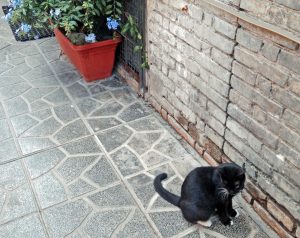 I asked to greet Leslie’s cat, “Raptus”, if she wasn’t off visiting her boyfriend. Human visitors milled about inside as the manager graciously placed the gift bags inside her tiny office. “You can adopt a cat and take it home,” she explained in English to a young British couple, “or you can adopt from a distance: support it and let it stay here. Many people do that.” I scanned the inside and outside again to look for Leslie’s cat. There were plenty of others about, and it felt like a child’s game to find hers. Glancing around, I spied elegant long and short haired cats, tabbies, calicoes, solid black, grey – and white! Eccola!/There she is! – making an entry in her own nonchalant, regal way. It didn’t matter that she barely glanced at me. I had seen her and that was enough.