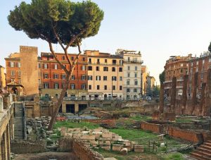 As soon as I’d settled into my hotel room, I gathered the neat stacks of zip-bagged potholders from my suitcase. They’d served admirably as art frame protectors for my exhibit at St. Paul’s Within the Walls.It was a lovely, cool morning and my mission was to head straight to the address. I laughed imagining myself as a smuggler delivering “contraband booty” of cat-themed potholders. Not to sell, well, not for me, anyway. These were for a special non-profit organization. Underground, sort of, but completely legit. The Largo del Torre Argentina contains the “Area Sacra,” an expansive ruin that was built on top of the senate building where Caesar was assassinated. The top layer of ruins lay at a good 4-5 meters below the surrounding street level.